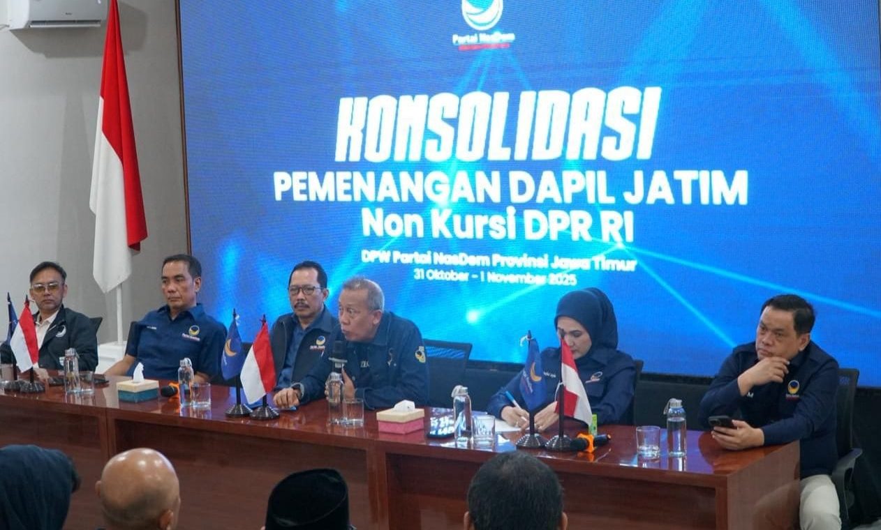 SURABAYA (31 Oktober): Wakil Ketua Umum Partai NasDem, Saan Mustopa, menghadiri konsolidasi Dewan Pimpinan Wilayah (DPW) Partai NasDem Jawa Timur yang digelar di Kantor DPW NasDem Jawa Timur, Jumat (31/10/2025).
