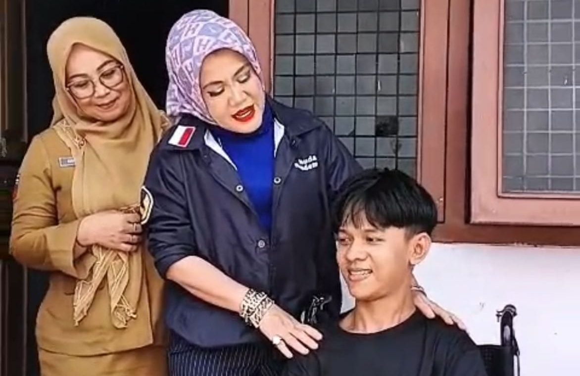 Mengenakan kerudung bernuansa biru, Devie menyerahkan langsung kursi roda untuk Yusuf. Bantuan tersebut bukan sekadar simbol, melainkan wujud nyata kepedulian dan cinta terhadap sesama.