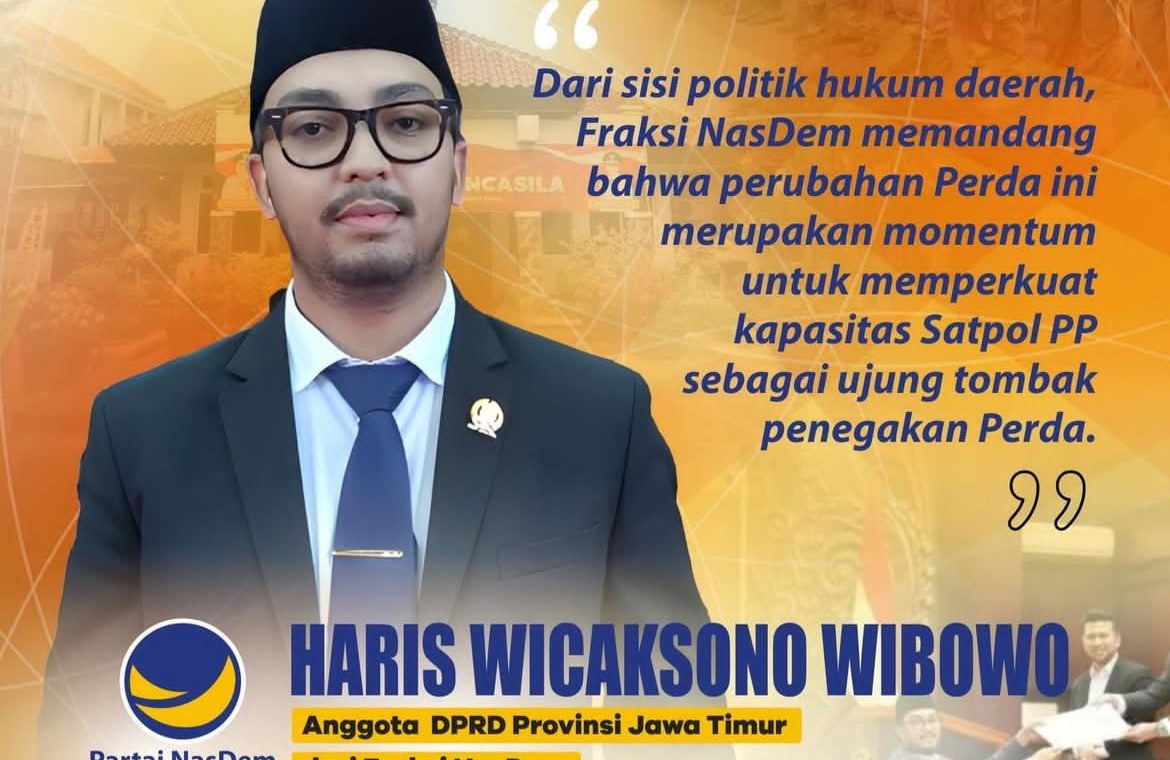 Juru bicara Fraksi Partai NasDem DPRD Jatim, Haris Wicaksono Wibowo, mengatakan perubahan regulasi itu harus mengarah pada peningkatan kapasitas Satpol PP sebagai garda terdepan penegakan perda.