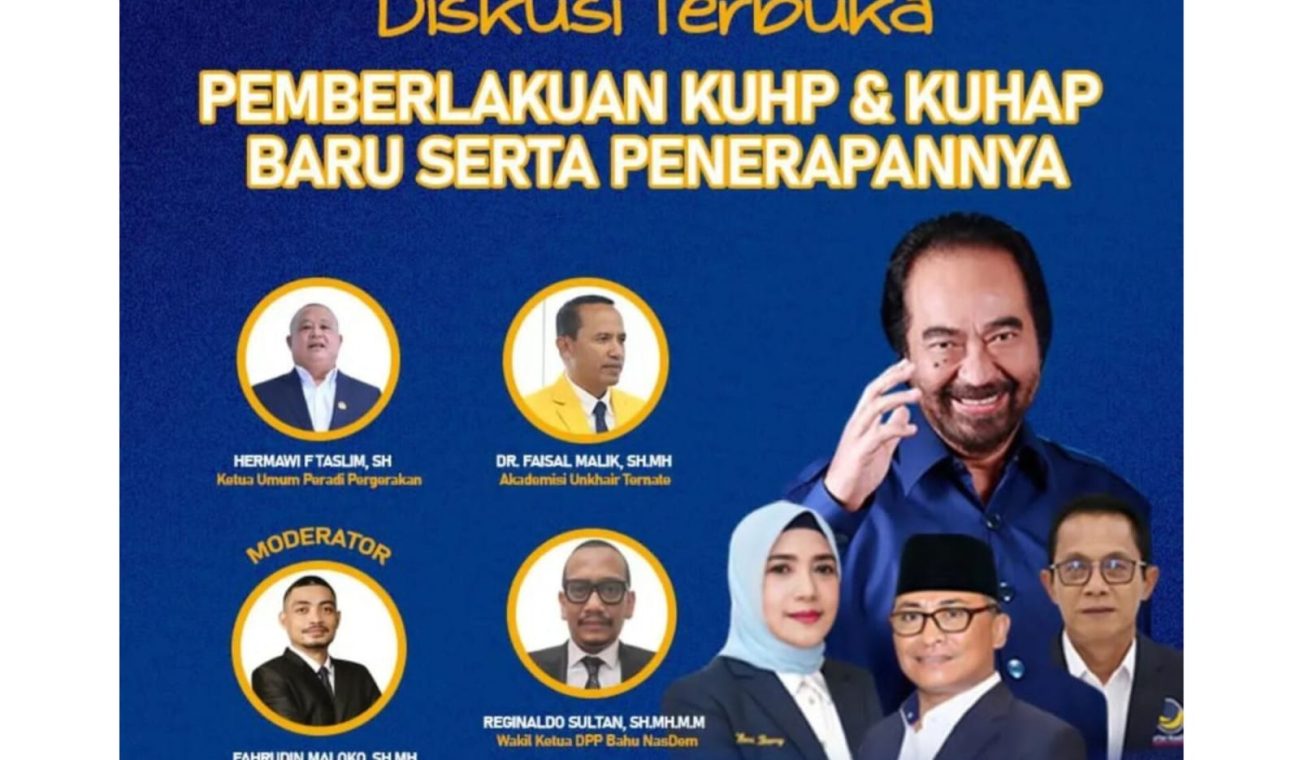 TERNATE (9 Februari): DPW Partai NasDem Provinsi Maluku Utara (Malut) menggelar diskusi publik bertema Pemberlakuan KUHP dan KUHAP Baru serta Penerapannya, di Cafe Restorasi, Ternate, Sabtu (7/2) malam. Diskusi digelar sebagai upaya mendorong literasi hukum dan membuka ruang dialog mengenai regulasi yang berdampak langsung pada masyarakat.
