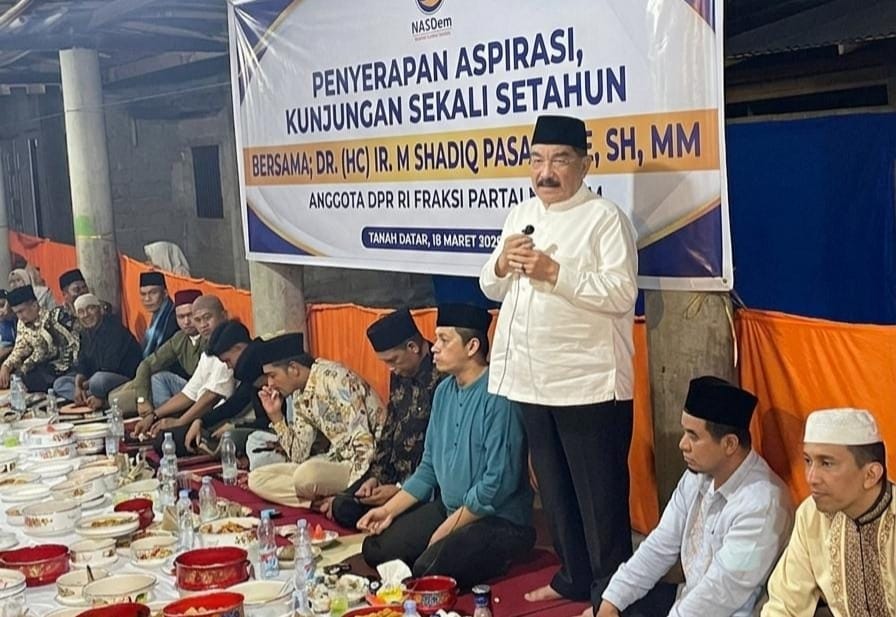 BATU SANGKAR (19 Maret): Anggota DPR RI dari Fraksi Partai NasDem, M. Shadiq Pasadigoe, melaksanakan kegiatan buka puasa bersama masyarakat di Nagari Taluak, Kecamatan Lintau Buo, Kabupaten Tanah Datar, Sumatra Barat, Rabu (18/3/2026).